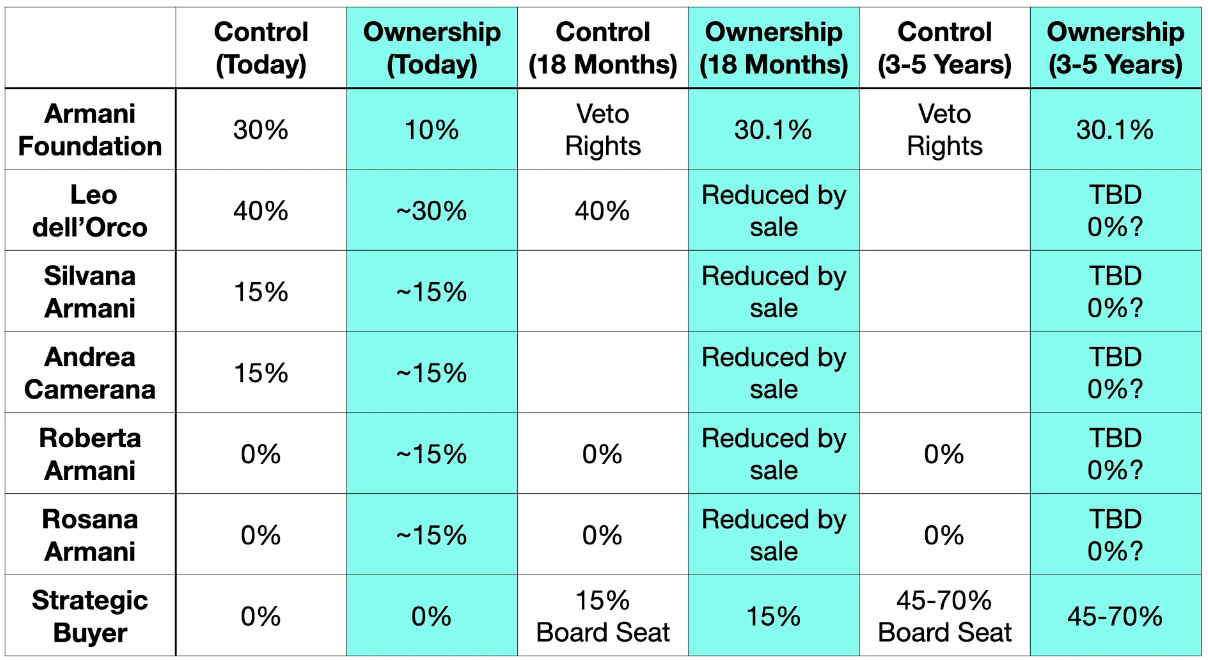 After the sale, dell’Orco will keep his 40% voting rights, despite a smaller holding, and the foundation will retain veto power on major decisions including all M&A activity. Think of this like a dating period, during which those closest to Armani’s vision can still decide to walk away. Then, within 3-5 years another 30-55% must be sold either to the same buyer or, if that does not occur, via a public offering.